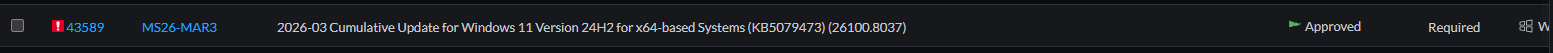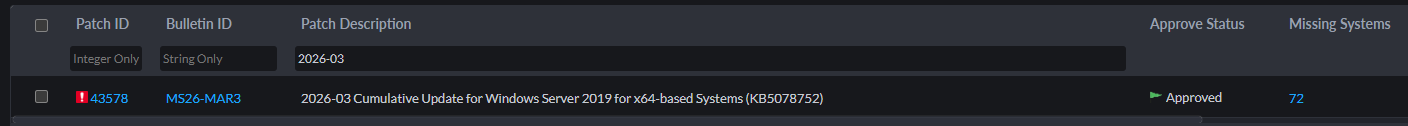 Hi, I'm experiencing an unusual issue. I can't see the 2026-03 Cumulative Update for Windows 10/11 (22H2, 24H2 and 25H2) in the 'Missing patches' section. Patch Management isn't counting computers without this update installed. In the 'Support patches' section, I can see all the March patches, but Patch Management cannot link them to computers lacking these patches.