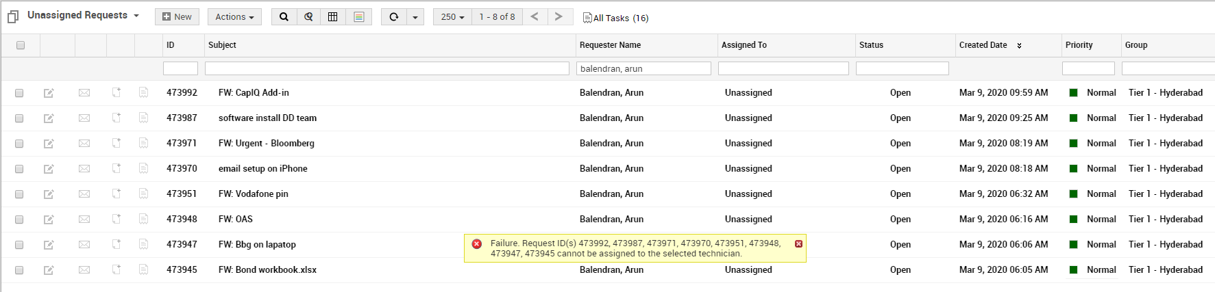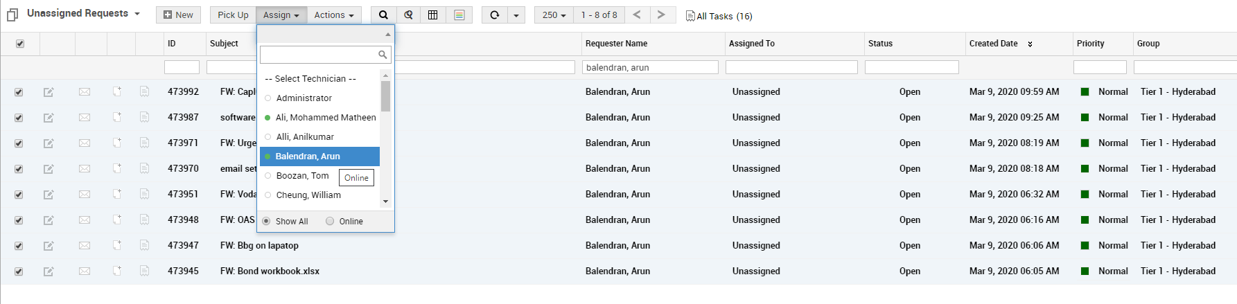 We currently have an On-Prem instance with multiple groups. All of the tickets default to the Tier 1 group. Many times, the Tier 2 team forwards in tickets for themselves. It would be beneficial if you could assign multiple tickets from the Requests' Assign dropdown no matter what group the technician is in. SDP should be smart enough to automatically change the group based on what technician you select.