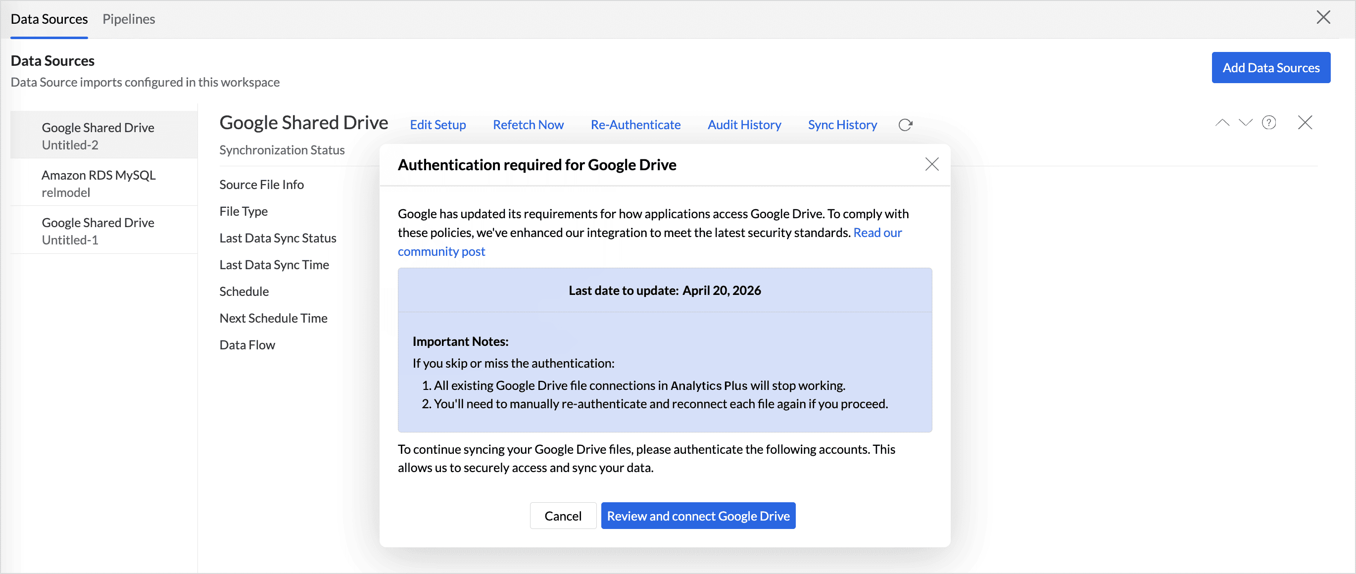 To ensure uninterrupted data sync, please re-authenticate each of your connected Google accounts. The last date for re-authentication is April 20, 2026.