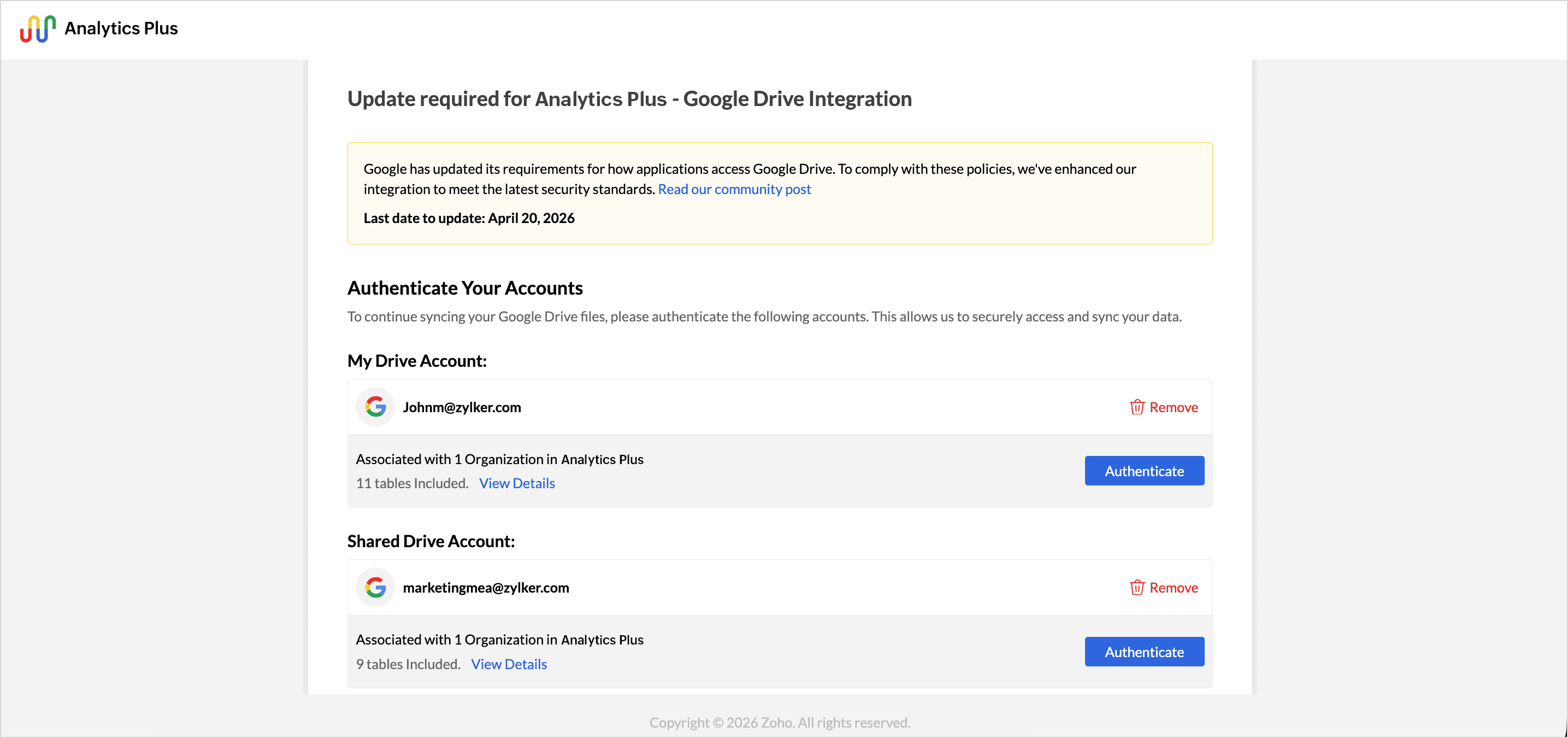This notification only applies to customers who have set up an integration between Google Drive and ManageEngine Analytics Plus. To align with Google’s latest updates on how apps access files in Google Drive, we’ve enhanced our integration to comply with the updated security and privacy standards, ensuring safer and more reliable access to your data.