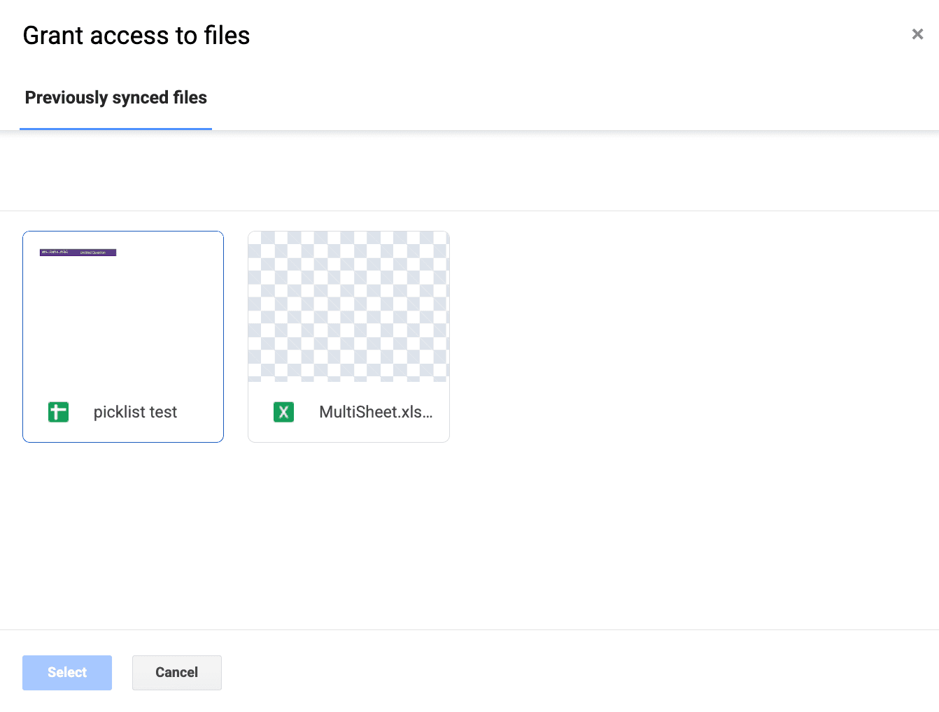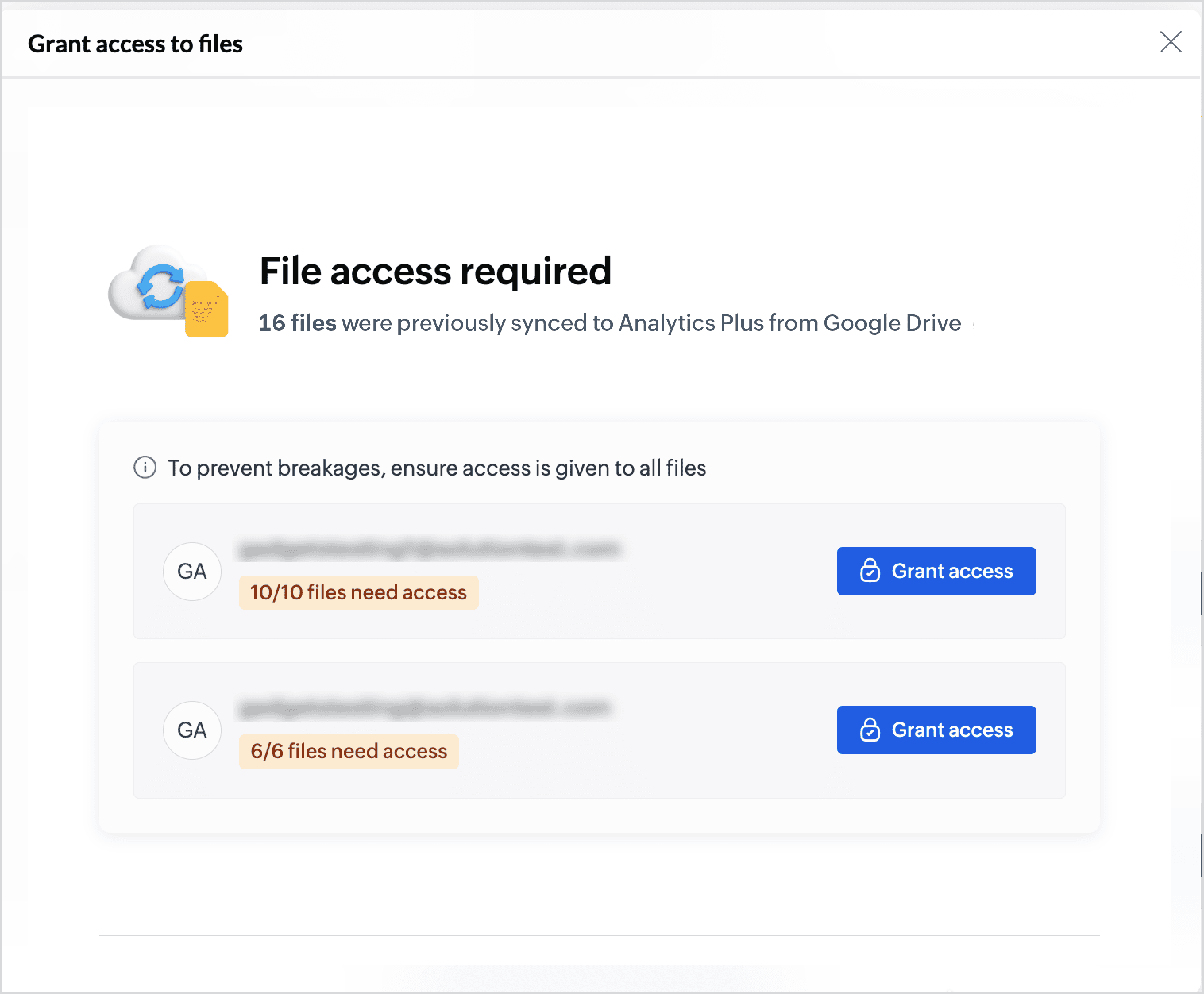 The File Access Required dialog will appear. Click Grant Access to select the files or tables for each authenticated accounts.