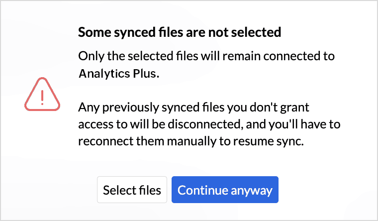 If any previously synced files are not selected, an alert message will appear prompting you to review your selection. Click Continue to complete the process.