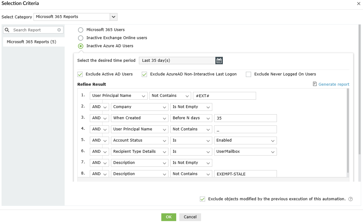 I have configured an automation for marking accounts which are inactive for 35days. These accounts must be disabled and an email must be triggered to their managers regarding the same. The task is disable users and notification is sent via the template. These are the filters.