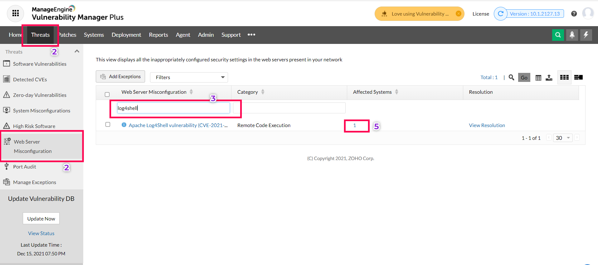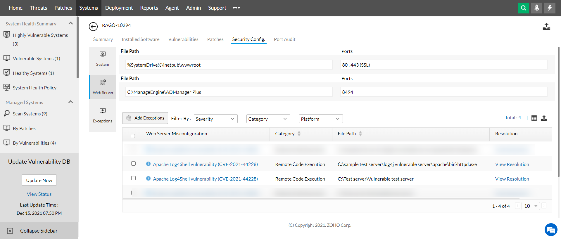 Alternatively, you can view all the affected systems in your network along with vulnerable web server installations on those systems in a report using a custom query. To do so,