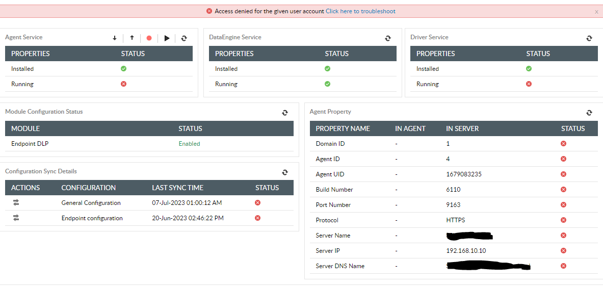 I'm experiencing several issues with Endpoint DLP. I have a domain where users don't have administrator access, and I'm unable to obtain reports such as printing or document editing activities. Additionally, some users are facing USB write restrictions, even though the policy isn't activated. I'll send screenshots of two errors that appear on the Agent panel. Can anyone assist me?