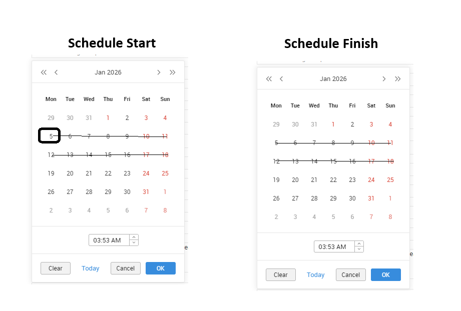 I raise a Change today say Monday 5th. When i go to select a start date of when i want to start it i cannot select any dates for the next two weeks. It will have to be from the third week onwards from 19th as per image below.