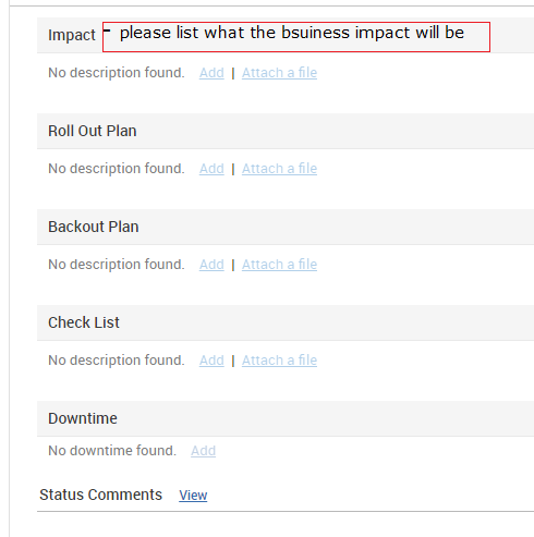 When raising a change request it has al the six stages. Un the planning tab there is an Analysis section which lists impact, Rollout plan, Backout plan, check list etc. Is it possible to rename the name IMPACT and/or add extra information