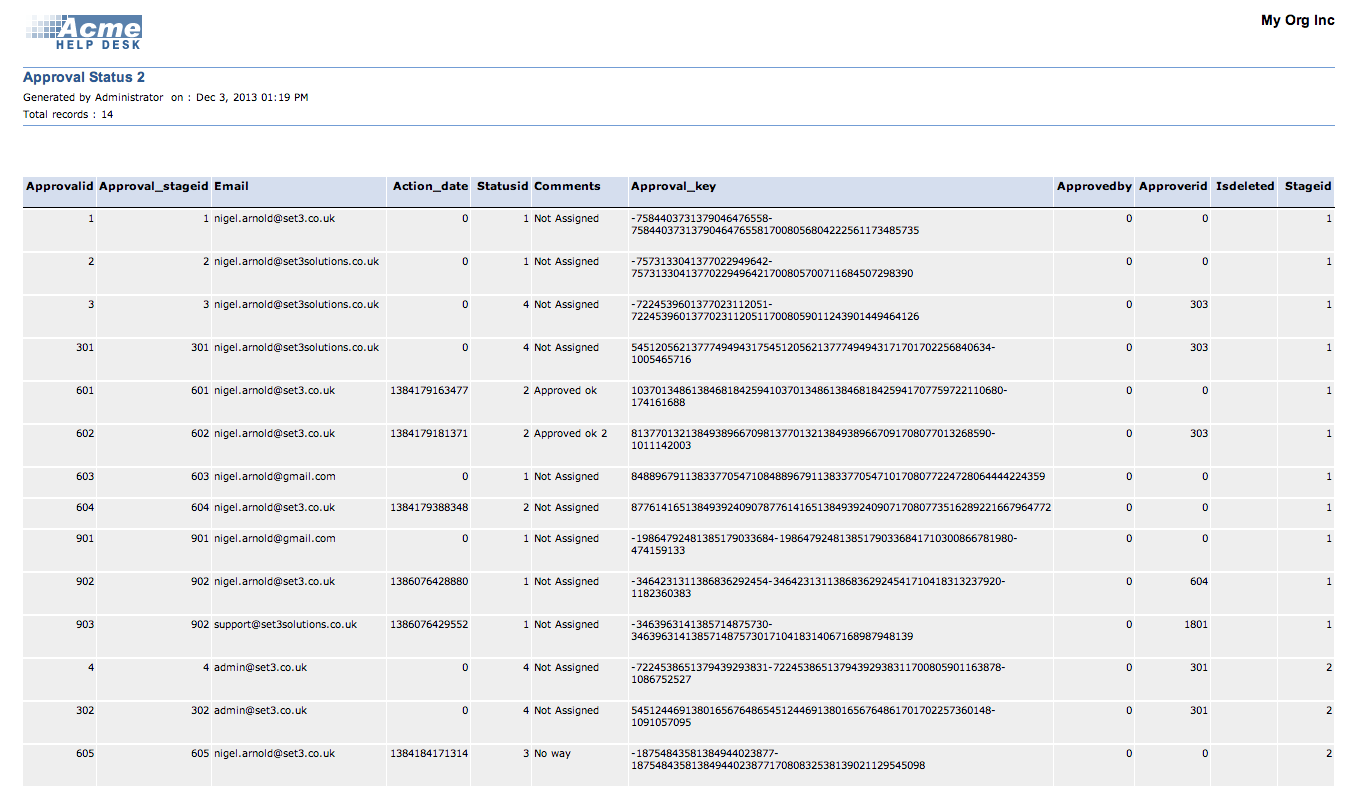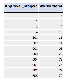 Now to get a useful report we'll need to draw on some other tables. The data table 'ApprovalStageMapping' cross references if the 'Approval_stageid' is mapped to a current request in ManageEngine ServiceDesk Plus by means of the 'workorderid':