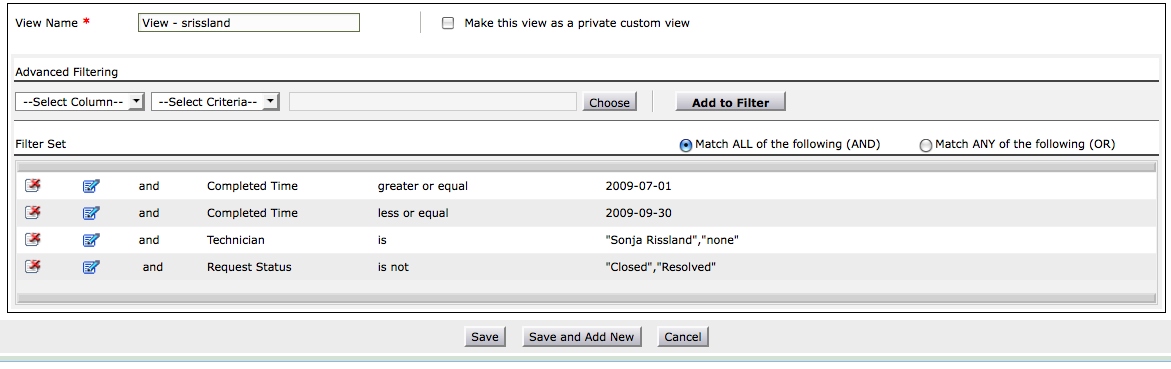 So for example, I created this view to look at all requests for a specific technician or unassigned that are not closed or resolved.