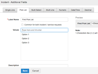 Next enter a request using this test Incident Template and check your dependency fields, you should see that the values of the 'Second Pick List' field will change dependent on the value of the 'First Pick List' field, in the example choosing 'Option 1' gives the two selections 'Option A & Option B' rather than all three: