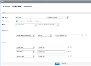 Whilst there are standard actions that can be defined for a Field and Form Rule, such as Enable / Show / Hide / Mandate fields, there is also an 'Action' option to 'Execute Script' which allows for even further customisation.
