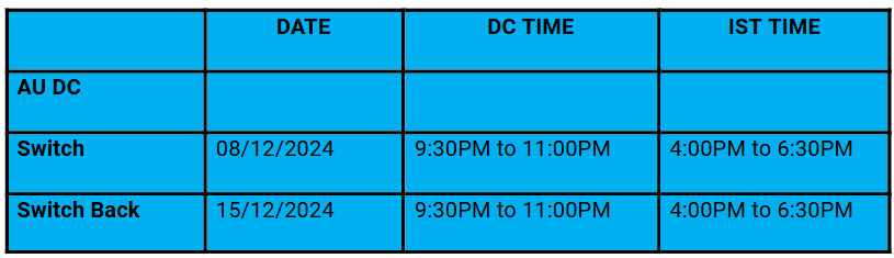 We have planned to conduct our yearly Disaster Recovery(DR) Drill for Zoho AU Service on 08th December 2024 and 15th December 2024 to ensure our DR Readiness in AU Deployment. This will help us support our expanding server far more efficiently.