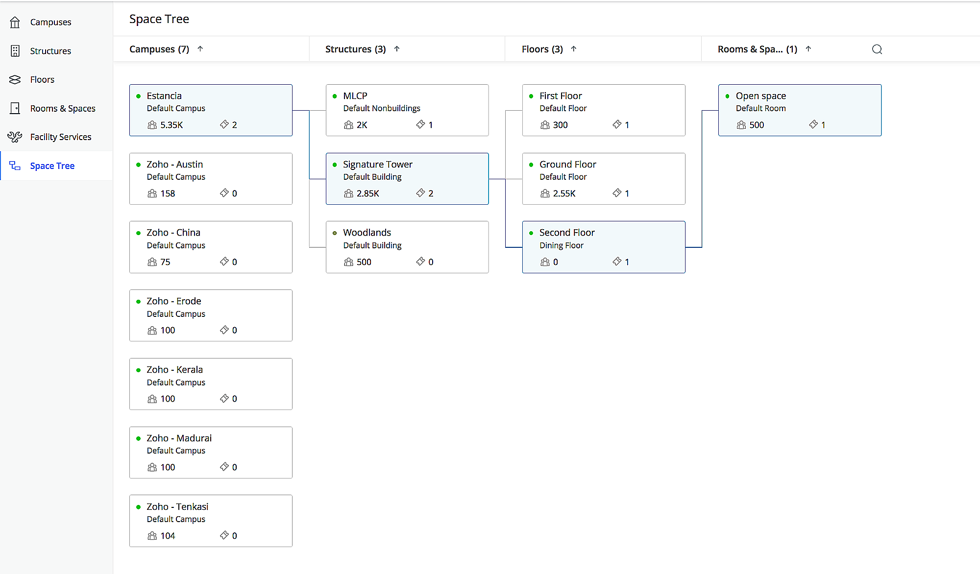 Under Space Tree, you can view the connection between the spaces, their total capacities and their associated requests in an expandable tree view. This helps you get an overview of all the spaces and their associations.