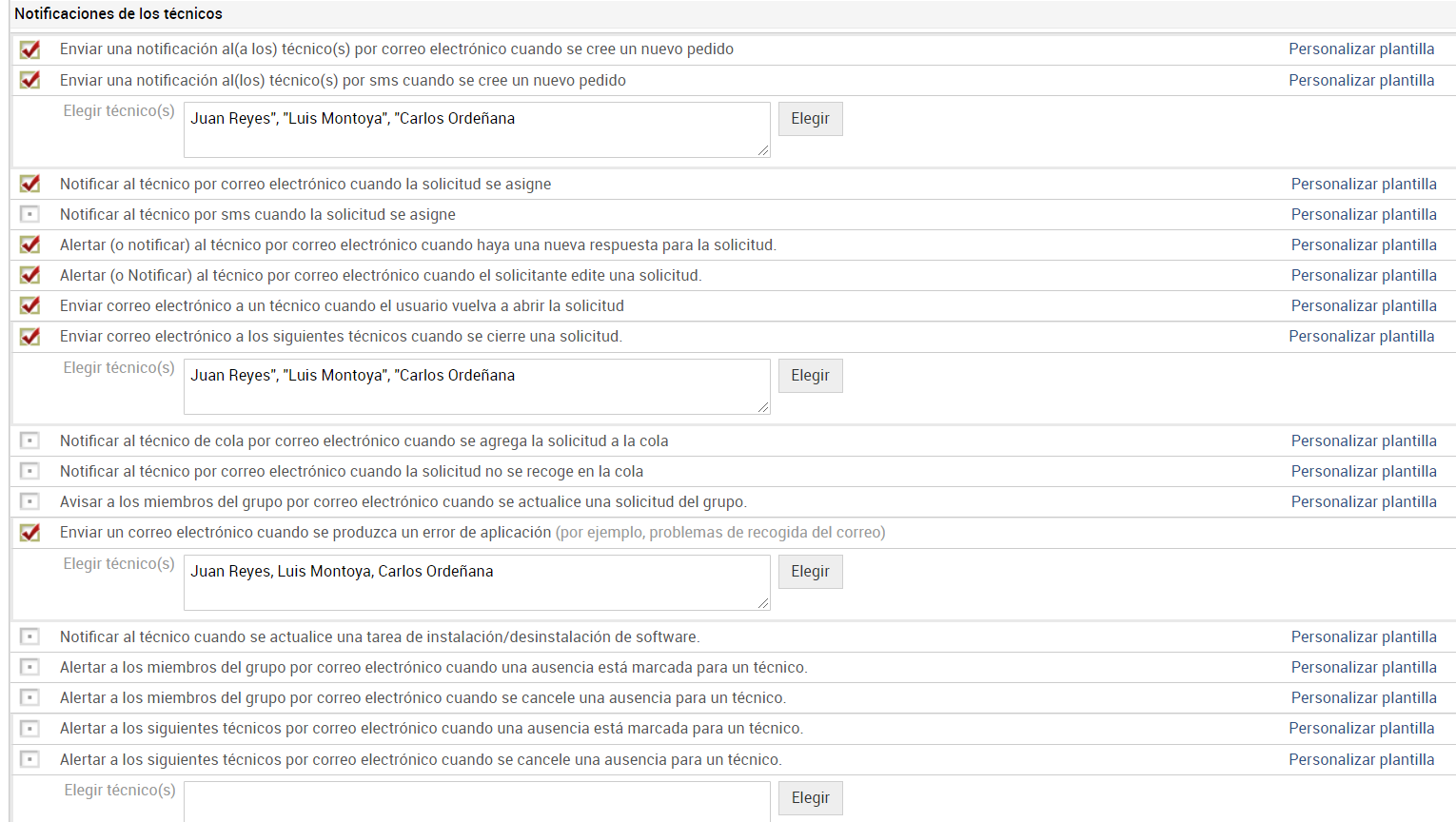 Estas son las reglas de notificación en las solicitudes configurada para los técnicos: