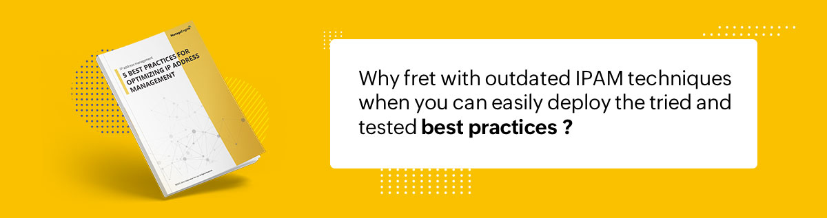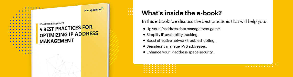 Dive into our tried and tested best practices that can efficiently enhance your modern network's IP address management strategy. Stay ahead of issues such as IP address conflict, enhance capacity planning, and eliminate the hassles of outdated techniques with our new e-book.