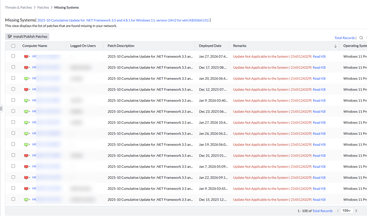 I have over 180 computers that Endpoint Center claims is missing the "2025-10 Cumulative Update for .NET Framework 3.5 and 4.8.1 for Windows 11, version 24H2 for x64 (KB5066131)" patch, but when the installation of the patch is attempted, the machine returns the message "Update Not Applicable to the System (-2145124329)". How do I clear these computers from the missing patch list? I've tried manually installing the patch on some of these machines and the installer returns a similar message. See the images below.