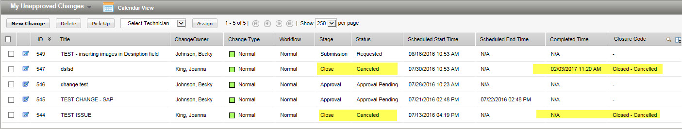 When I submit a change, request approval, get approval, manually change the status of the change to "Approved" the change still appears on my "unapproved changes" widget on my home page in the helpdesk tool. Am I missing something here ?