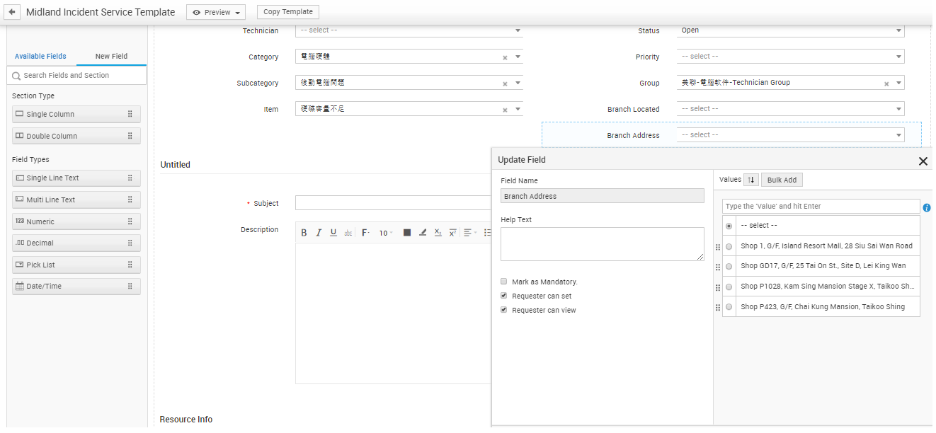 Now I've created two Pick list fields on the form named "Branch Located" and "Branch Address"