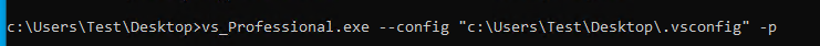 We have a pre-prepared config file for the Visual Studio installer which installs the necessary addons we want. Running the installer from an elevated command prompt installs without issue, however it does require an absolute path for the config file to work.