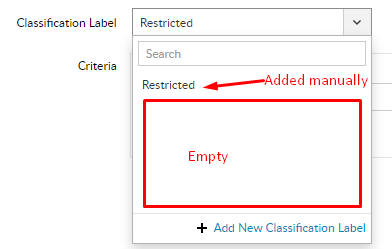 In Risk Analysis there is an option to add a classification profile that will mark all files matched by a policy with a label. While adding a new profile, classification label drop down was empty even there are four predefined categories of labels. So we created a new label called "Restricted".
