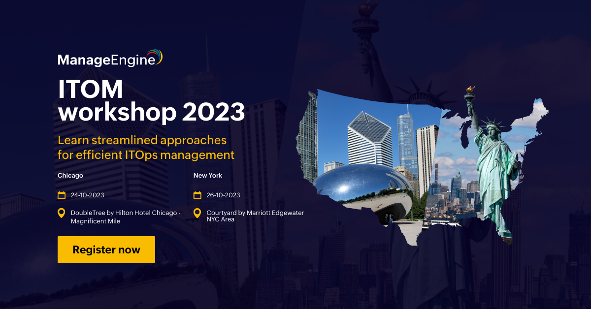 We are excited to invite you to the upcoming ManageEngine ITOM Workshops happening in Chicago and New York, on 24th and 26th of October, respectfully. Throughout this workshop, you'll have the opportunity to explore various facets of IT operations management in a detailed manner.