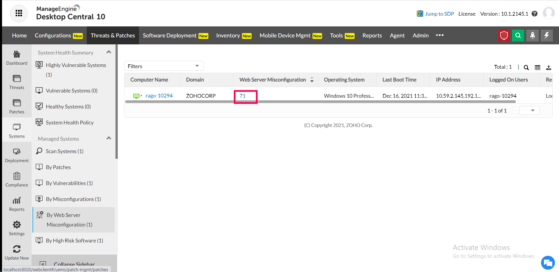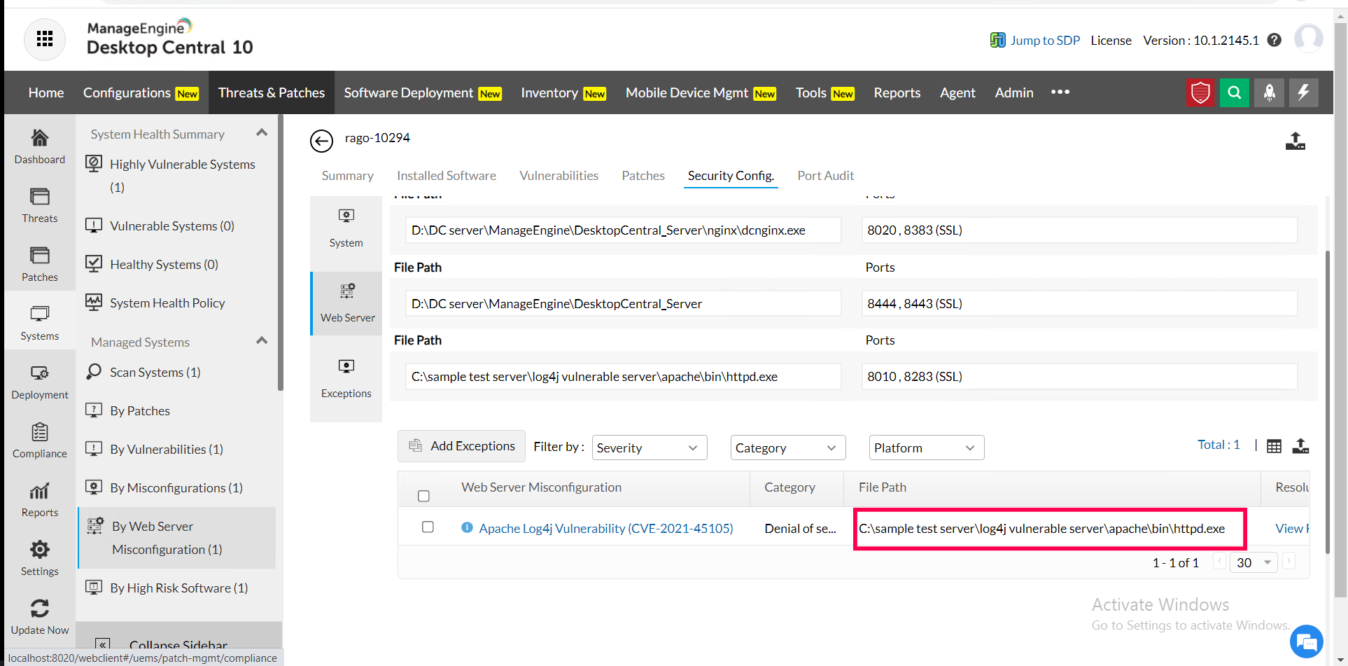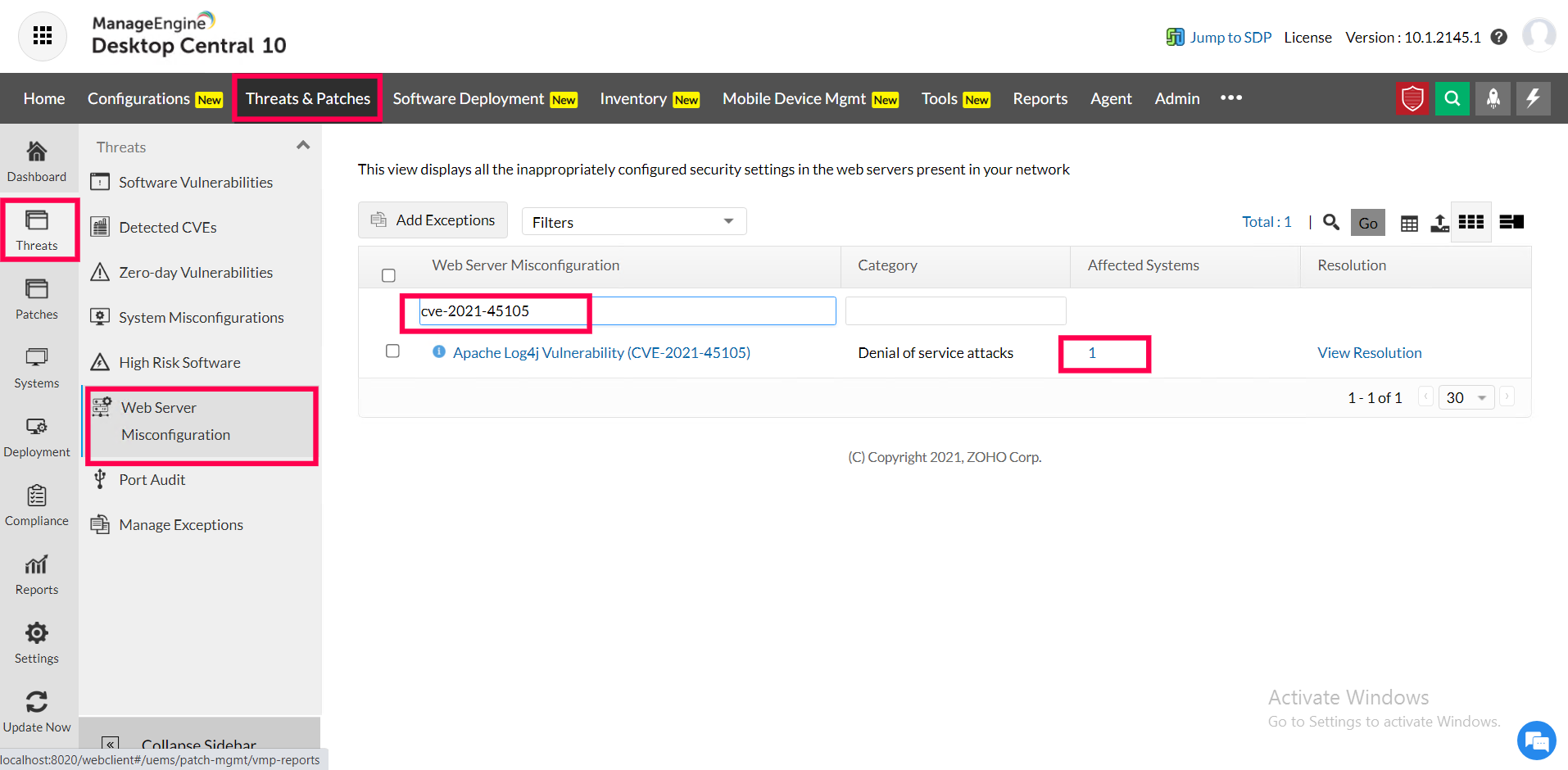 2) Navigate to Threats and patches> Threats > Web server misconfigurations