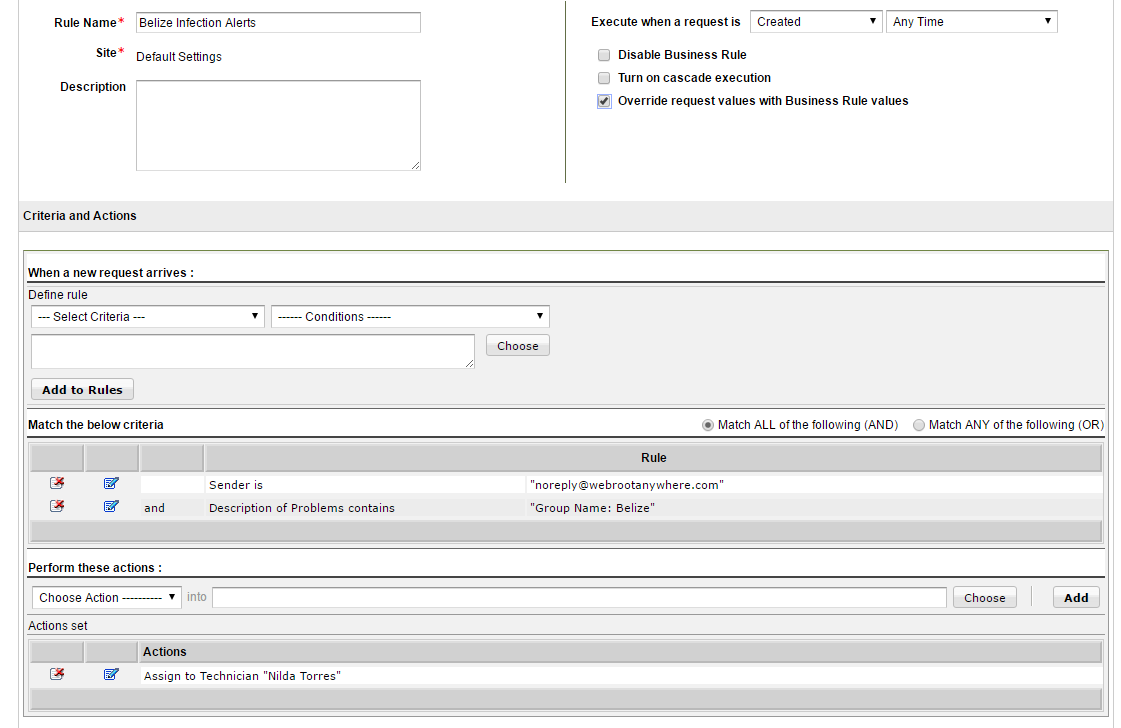 3. I The below is a snippet of a ticket created from an alert email and the business rule I have created. I would like to assign the ticket to a technician by using the Group Name as a criteria. Can you please assist me??