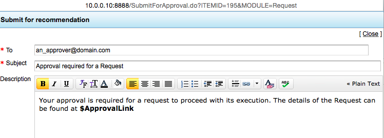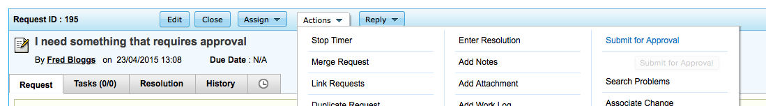 First off, approvals. Now you may use or have looked at the approvals mechanisms in ServiceDesk Plus. For example a technician can perform an action 'Submit for Approval' on a request to raise a manual approval which is electronically audited: