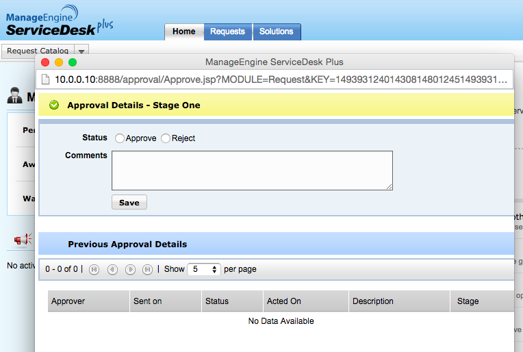 This link is, in-fact, the same link that they would have received from the default email notification. By clicking on the link in the their self-service portal they will see the details for the required approval action: