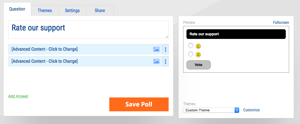In the example above we used the advanced editor option on each question and used the 'smileys' available in the editor. If you want a larger smiley you can choose to upload your own graphics to each question :0) There are also plenty of options to save and create your own themes for displaying the poll.