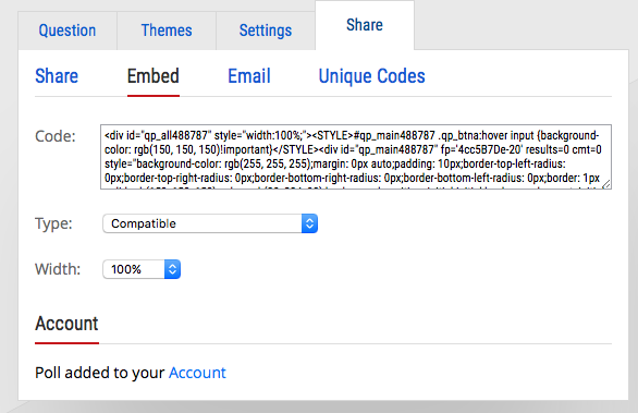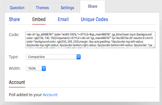 Once you've got the poll looking how you want the 'Settings' tab defines a range of options for controlling how the user interacts with the poll and whether they will be able to see the running poll results. Finally the 'Share' tab gives you a range of options for sharing your poll. In this case we used the 'Embed' options sub-tab to obtain suitable code for embedding in an HTML page: