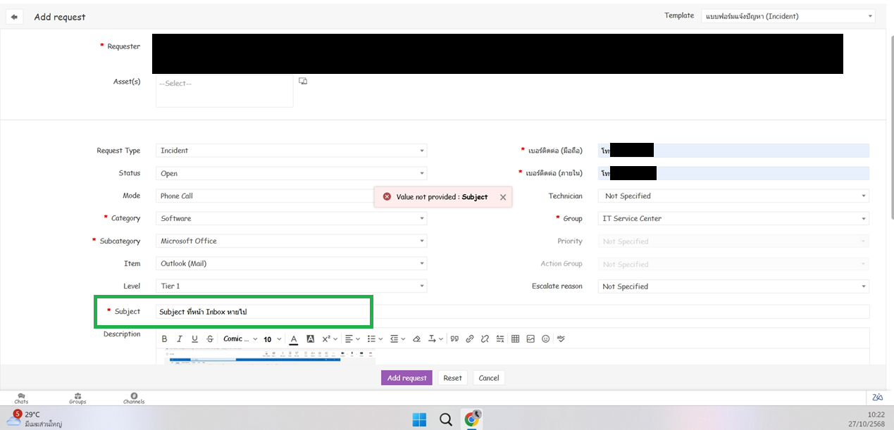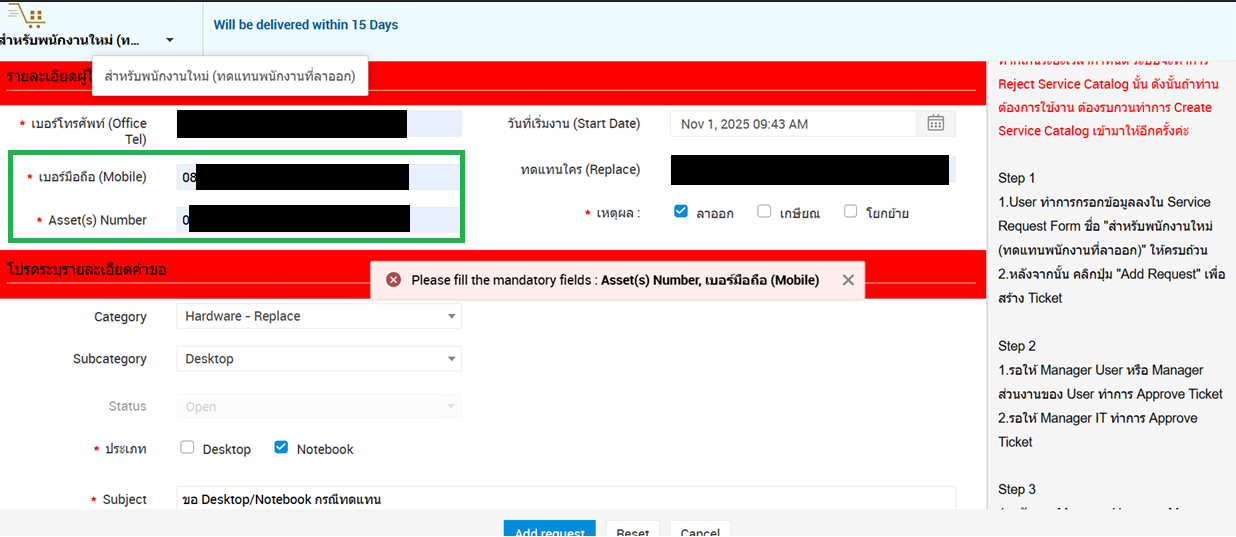 Though user (or technician) fill all of the mandatory fields and try to submit a request, the error appear