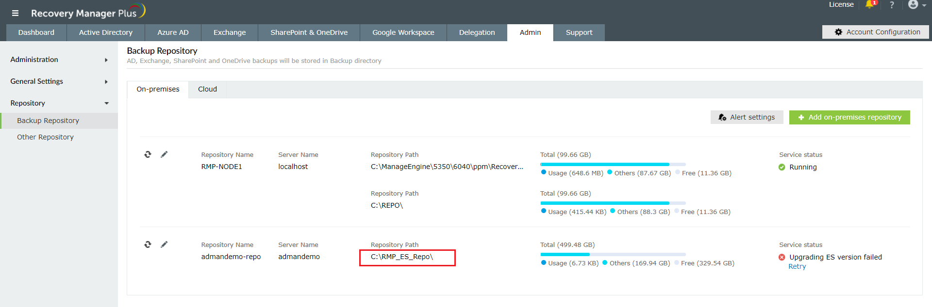 - If you have configured on-premises backup repositories in RecoveryManager Plus other than RMP-NODE1, you will have to make the same changes to jvm.options file in those repositories.