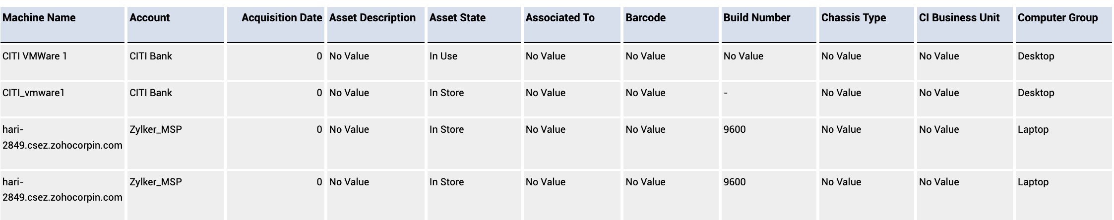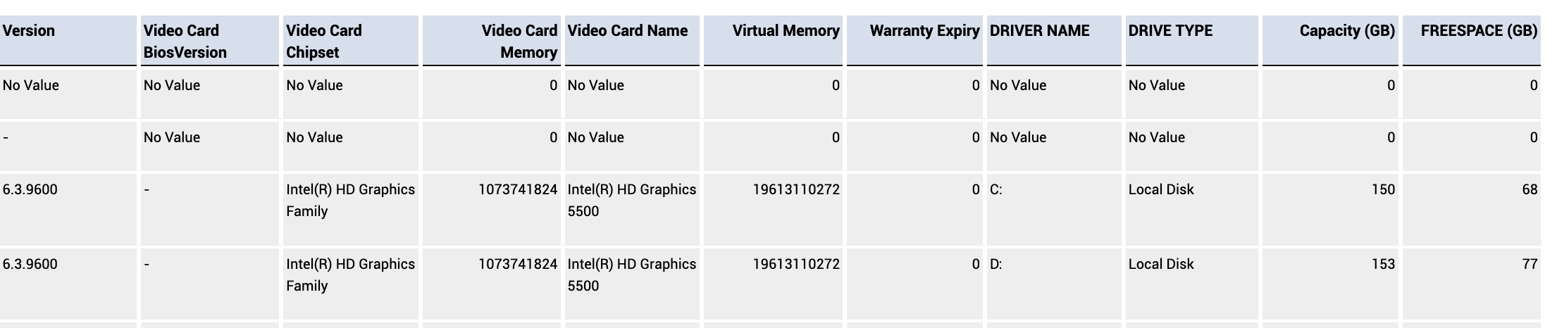 SELECT MAX("workstation"."WORKSTATIONNAME") AS "Machine Name", MAX("ad"."ORG_NAME") AS "Account", MAX("resource"."ACQUISITIONDATE") AS "Acquisition Date", MAX("resFields"."UDF_CHAR6") AS "Asset Description", MAX("state"."DISPLAYSTATE") AS "Asset State", MAX("rToAssetResource"."RESOURCENAME") AS "Associated To", MAX("barcodes"."BARCODE") AS "Barcode", MAX("osInfo"."BUILDNUMBER") AS "Build Number", MAX("chassisType"."NAME") AS "Chassis Type", MAX("resFields"."UDF_CHAR5") AS "CI Business Unit", MAX("compGrps"."NAME") AS "Computer Group", MAX("resToCost"."CURRENTCOST") AS "Current Book Value", MAX("deptDef"."DEPTNAME") AS "Department", MAX("dominf"."DOMAINNAME") AS "Domain Name", MAX("resFields"."UDF_CHAR9") AS "DR Required", MAX("resFields"."UDF_CHAR9") AS "DR Required", MAX("resource"."EXPIRYDATE") AS "Expiry Date", MAX("resFields"."UDF_CHAR8") AS "Financially Required -", MAX("resFields"."UDF_CHAR3") AS "IMEI", MAX("resFields"."UDF_CHAR7") AS "IT Fixed Assets", MAX("kbInfo"."MANUFACTURER") AS "Keyboard Manufacturer", MAX("kbInfo"."KEYBOARDSERIALNUMBER") AS "Keyboard Serial Number", MAX("kbInfo"."KEYBOARDTYPE") AS "Keyboard Type", MAX("workstation"."LOGGEDUSER") AS "Last Logged In User", MAX("resLease"."ENDTIME") AS "Loan End", MAX("resLease"."STARTTIME") AS "Loan Start", MAX("resLocation"."LOCATION") AS "Location", MAX("workstation"."LOGICALCPUCOUNT") AS "Logical Processors", MAX("resFields"."UDF_CHAR10") AS "Mac Address", MAX("resFields"."UDF_CHAR1") AS "Manufacture Date", MAX("workstation"."MANUFACTURER") AS "Manufacturer", MAX("workstation"."MODEL") AS "Model", MAX("moniInfo"."MANUFACTURER") AS "Monitor Manufacturer", MAX("moniInfo"."MAXRESOLUTION") AS "Monitor MaxResolution", MAX("moniInfo"."SERIALNUMBER") AS "Monitor Serial Number", MAX("moniInfo"."MONITORTYPE") AS "Monitor Type", MAX("mouseInfo"."MOUSEBUTTONS") AS "Mouse Buttons", MAX("mouseInfo"."MOUSEMANUFACTURER") AS "Mouse Manufacturer", MAX("mouseInfo"."MOUSESERIALNUMBER") AS "Mouse Serial Number", MAX("mouseInfo"."MOUSETYPE") AS "Mouse Type", MAX("resFields"."UDF_CHAR4") AS "Notes", MAX("resToCost"."OPERATIONALCOST") AS "Operational Cost", MAX("resource"."SERIALNO") AS "Org Serial Number", MAX("osInfo"."OSNAME") AS "OS", MAX("procInfo"."PROCESSORCOUNT") AS "Processor Count", MAX("procInfo"."CPUNAME") AS "Processor Name", MAX("procInfo"."SPEED") AS "Processor Speed (in MHz)", MAX("procInfo"."VENDOR") AS "Processor Vendor", MAX("product"."COMPONENTNAME") AS "Product", MAX("osInfo"."PRODUCTID") AS "Product ID", MAX("resToCost"."PURCHASECOST") AS "Purchase Cost", MAX("resFields"."UDF_CHAR2") AS "Purchase Order", MAX("regionDef"."REGIONNAME") AS "Region", MAX("osInfo"."SERVICEPACK") AS "Service Pack", MAX("workstation"."SERVICETAG") AS "Service Tag", MAX("aaov"."NAME") AS "Site", MAX("scInfo"."SOUNDCARDNAME") AS "Sound Card Name", MAX("osInfo"."SYSTEMTYPE") AS "System Type", MAX("resToCost"."TOTALCOST") AS "Total Cost", MAX("memInfo"."TOTALMEMORY") AS "Total Memory", MAX("aaaUser"."FIRST_NAME") AS "User", MAX("aao"."NAME") AS "Vendor Name", MAX("osInfo"."VERSION") AS "Version", MAX("mmInfo"."VIDEOCARDBIOSVERSION") AS "Video Card BiosVersion", MAX("mmInfo"."VIDOECARDCHIPSET") AS "Video Card Chipset", MAX("mmInfo"."VIDEOCARDMEMORY") AS "Video Card Memory", MAX("mmInfo"."VIDOECARDNAME") AS "Video Card Name", MAX("memInfo"."VIRTUALMEMORY") AS "Virtual Memory", MAX("resource"."WARRANTYEXPIRY") AS "Warranty Expiry", dinfo.DRIVENAME AS "DRIVER NAME",dinfo.DRIVETYPE AS "DRIVE TYPE",(dinfo.CAPACITY/1024/1024/1024) AS "Capacity (GB)",(dinfo.FREESPACE/1024/1024/1024) AS "FREESPACE (GB)" FROM "SystemInfo" "workstation" LEFT JOIN "Resources" "resource" ON "workstation"."WORKSTATIONID"="resource"."RESOURCEID" LEFT JOIN "ComponentDefinition" "product" ON "resource"."COMPONENTID"="product"."COMPONENTID" LEFT JOIN "ComponentDefinitionComputer" "compDefComputer" ON "product"."COMPONENTID"="compDefComputer"."COMPONENTID" LEFT JOIN "ComputerGroups" "compGrps" ON "compDefComputer"."COMPUTERGROUPID"="compGrps"."ID" LEFT JOIN "VendorDefinition" "resourceVendor" ON "resource"."VENDORID"="resourceVendor"."VENDORID" LEFT JOIN "SDOrganization" "aao" ON "resourceVendor"."VENDORID"="aao"."ORG_ID" LEFT JOIN "ResourceState" "state" ON "resource"."RESOURCESTATEID"="state"."RESOURCESTATEID" LEFT JOIN "ResourceOwner" "rOwner" ON "resource"."RESOURCEID"="rOwner"."RESOURCEID" LEFT JOIN "ResourceAssociation" "rToAsset" ON "rOwner"."RESOURCEOWNERID"="rToAsset"."RESOURCEOWNERID" LEFT JOIN "Resources" "rToAssetResource" ON "rToAsset"."ASSTTORESOURCEID"="rToAssetResource"."RESOURCEID" LEFT JOIN "SDUser" "sdUser" ON "rOwner"."USERID"="sdUser"."USERID" LEFT JOIN "AaaUser" "aaaUser" ON "sdUser"."USERID"="aaaUser"."USER_ID" LEFT JOIN "DepartmentDefinition" "deptDef" ON "rOwner"."DEPTID"="deptDef"."DEPTID" LEFT JOIN "ResourceLocation" "resLocation" ON "resource"."RESOURCEID"="resLocation"."RESOURCEID" LEFT JOIN "RegionDefinition" "regionDef" ON "resLocation"."REGIONID"="regionDef"."REGIONID" LEFT JOIN "SiteDefinition" "siteDef" ON "resLocation"."SITEID"="siteDef"."SITEID" LEFT JOIN "SDOrganization" "aaov" ON "siteDef"."SITEID"="aaov"."ORG_ID" LEFT JOIN "ResourceLease" "resLease" ON "resource"."RESOURCEID"="resLease"."RESOURCEID" LEFT JOIN "Barcodes" "barcodes" ON "resource"."BARCODEID"="barcodes"."BARCODEID" LEFT JOIN "ResourceToCost" "resToCost" ON "resource"."RESOURCEID"="resToCost"."RESOURCEID" INNER JOIN "AccountSiteMapping" "asm" ON "resource"."SITEID"="asm"."SITEID" INNER JOIN "AccountDefinition" "ad" ON "asm"."ACCOUNTID"="ad"."ORG_ID" LEFT JOIN "ChassisTypes" "chassisType" ON "resource"."CHASSISTYPEID"="chassisType"."ID" LEFT JOIN "MemoryInfo" "memInfo" ON "workstation"."WORKSTATIONID"="memInfo"."WORKSTATIONID" LEFT JOIN "OsInfo" "osInfo" ON "workstation"."WORKSTATIONID"="osInfo"."WORKSTATIONID" LEFT JOIN "ProcessorInfo" "procInfo" ON "workstation"."WORKSTATIONID"="procInfo"."WORKSTATIONID" LEFT JOIN "KeyboardInfo" "kbInfo" ON "workstation"."WORKSTATIONID"="kbInfo"."WOR