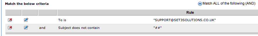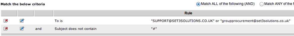 Now emails that are sent from a Request, and hopefully by default their responses (most users don't tend to alter a subject line but just hit reply), will include the default text of '##<Request ID>##' in the subject line. We can, therefore, use this as part of our Spam Filter settings along with the appropriate inbound email account we are trying to reject ad-hoc emails, in this example 'support@set3solutions.co.uk':