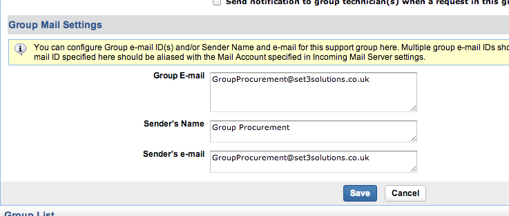 What's more this will still work if you have multi-department usage of ManageEngine ServiceDesk Plus where Support Groups for the other departments are defined with appropriate email aliases, The example below shows a the email alias settings for a Group Procurement Support Group (note - an email forward must be in place to send these emails to the default email account used by ManageEngine ServiceDesk Plus):