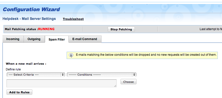 The Spam Filter allows us to define match criteria for incoming emails - if the emails match the filter criteria ManageEngine ServiceDesk Plus will simply drop these emails and not create a Request from them.