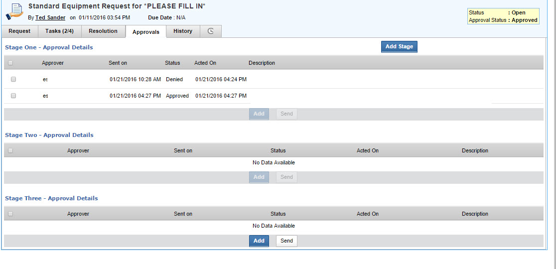 How do I delete approval stages off of Service Requests? I've got a ticket that somehow ended up with a blank stage. Here's what it ends up looking like. The approver in Stage 2 was wrong, so the tech tried to delete and replace it, but it would only let him add another stage not another approved to Stage 2. Now, the approved in stage 3 can't approve it because they get the 'already approved' notice.