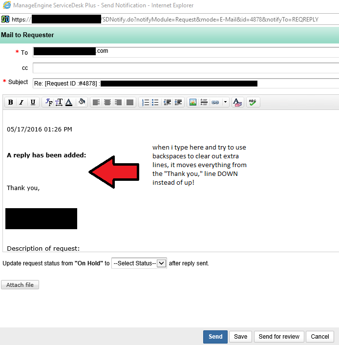 When using the backspace key to remove extra spaces (I do not know why these are here in the first place) it actually ADDS lines to the text box! I have to mess around with different selections and combinations of Backspace and Delete before I can get the reply properly formatted.