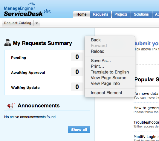 First off we used the power of a modern browser, like Google Chrome, with it's in-built developer tools to discover the style element of any part of the self-service portal page that we were interested in changing. Let's say we wanted to change the blue backdrop on the left hand column of the self-service portal which is not controlled by the Theme options of the GUI in ServiceDesk Plus. All we need do is right click the blue background and choose 'Inspect Element':