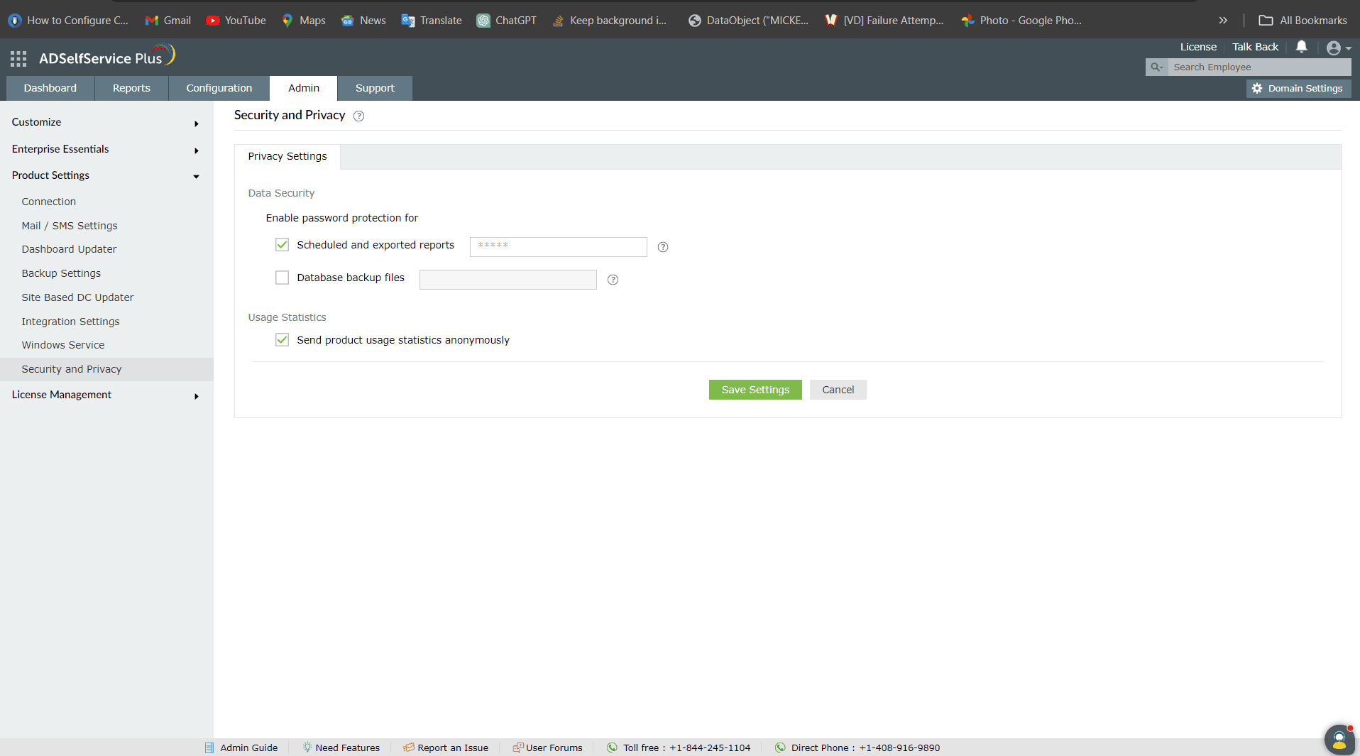 Log into ADSelfService Plus with administrator credentials and navigate to Admin > Security and Privacy > Privacy Settings > Data Security.