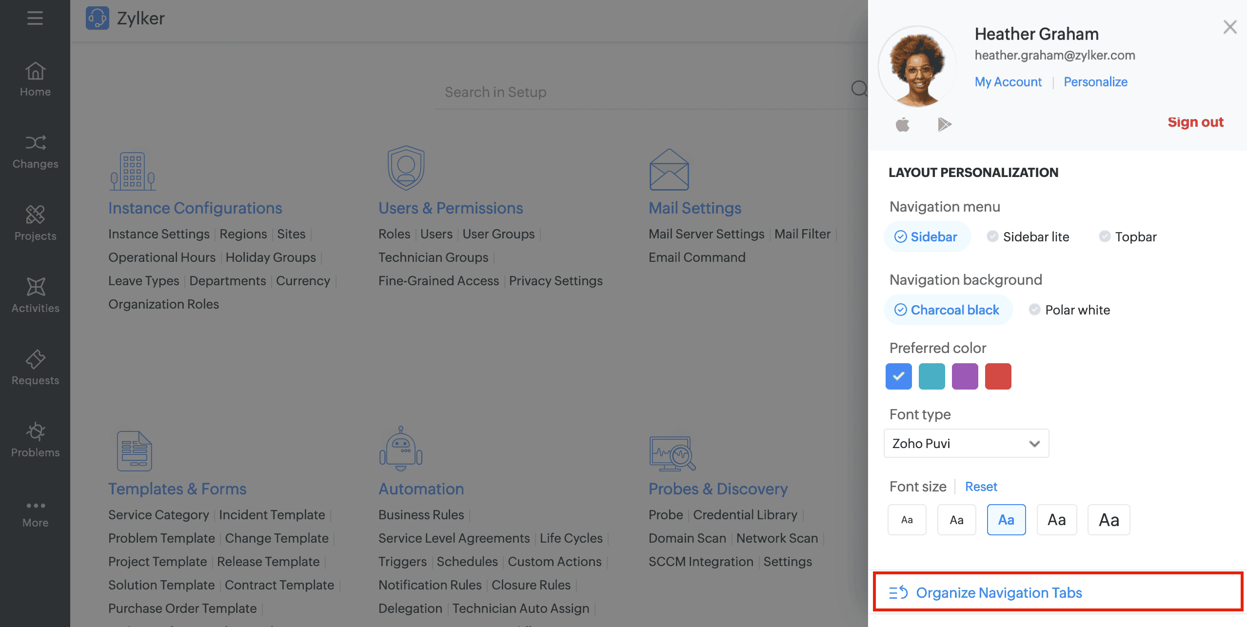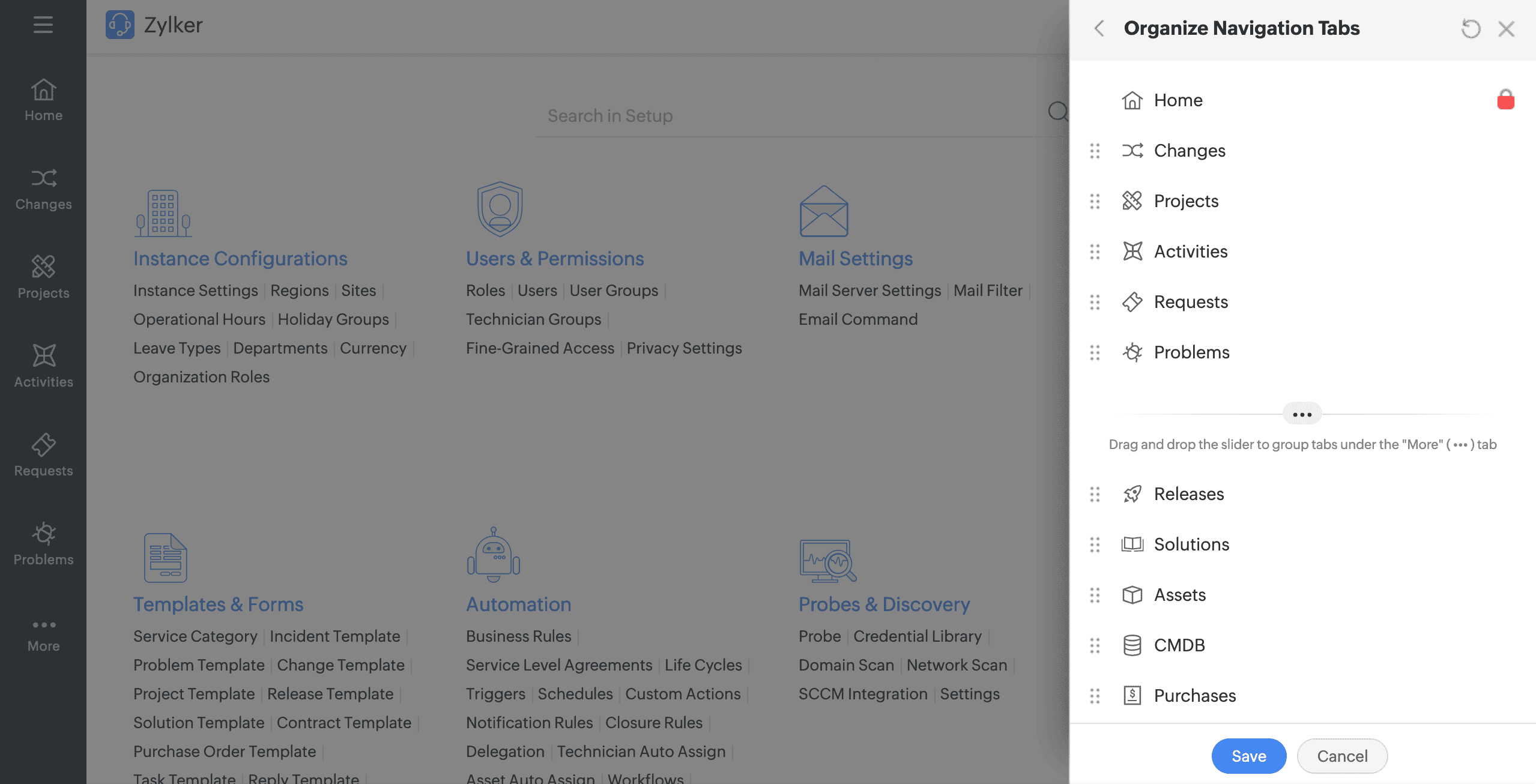 You can now reorder and change the visibility of navigation tabs and footer menus for technicians and requesters under Setup > General Settings > Navigation & Footer Settings.