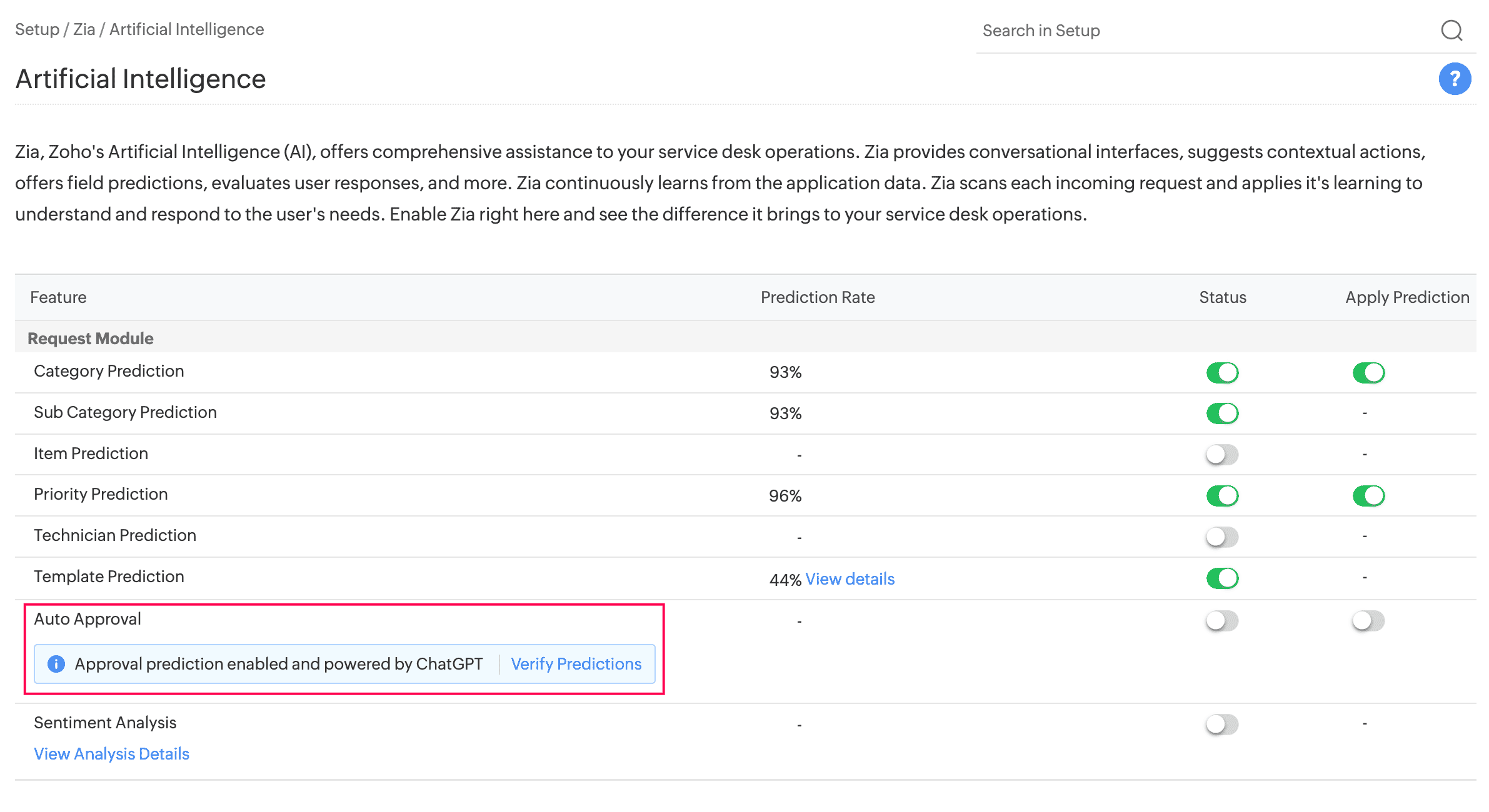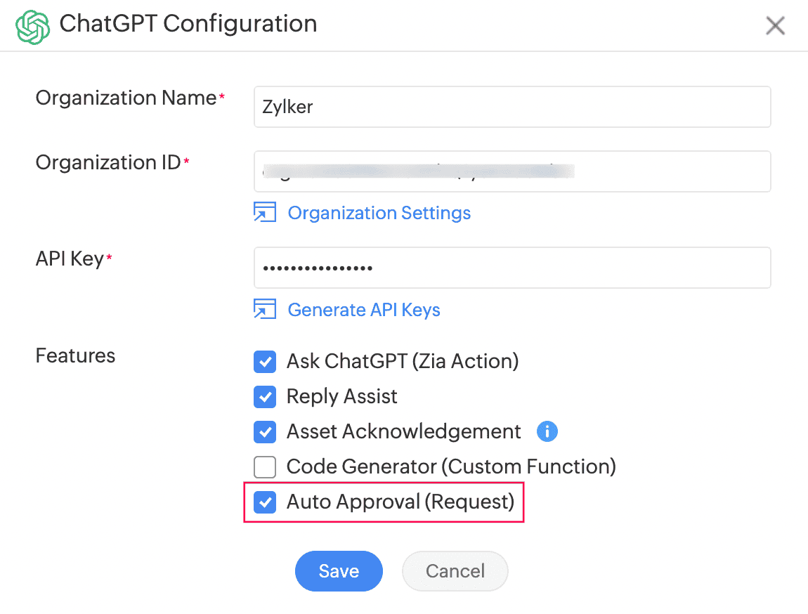 Enabling Auto Approval (Request) in the ChatGPT configuration page will disable Zia's auto approval and vice-versa.