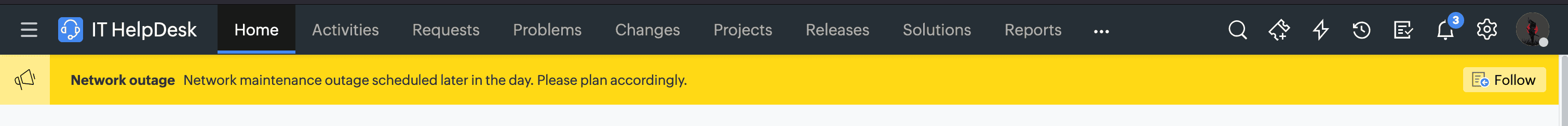 Maintain associations between announcements and modules such as Requests, Changes, Problems, and Releases. For instance, you can create an announcement for request that has been fixed.Group-Specific Announcements