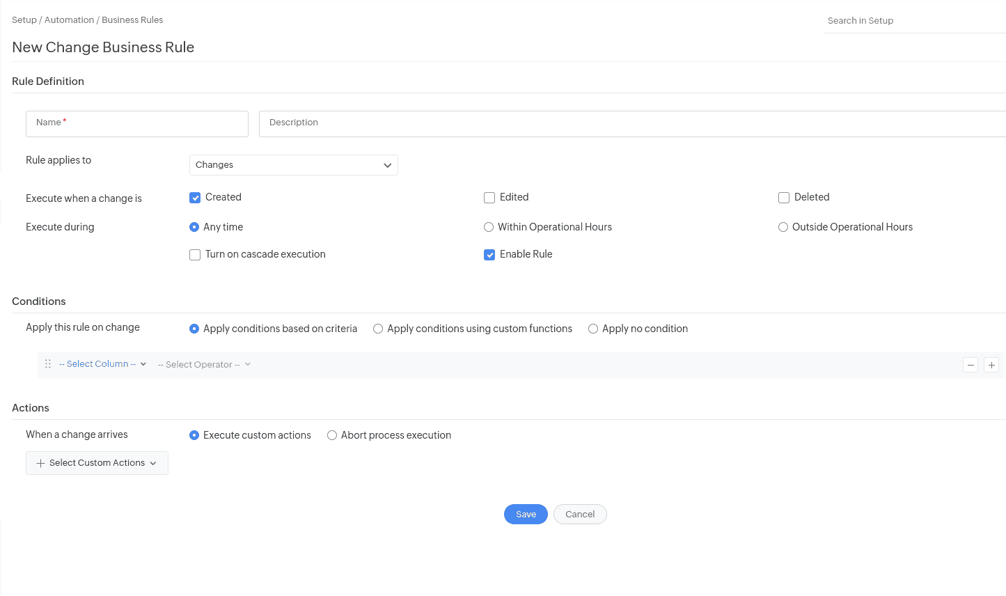 Business rules can now be applied to change records. It can be used to configure field updates and execute custom actions or abort process executions on changes that meet the set criteria. You can trigger a business rule when a change record is created, edited, or deleted.