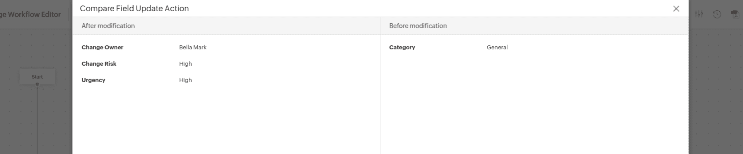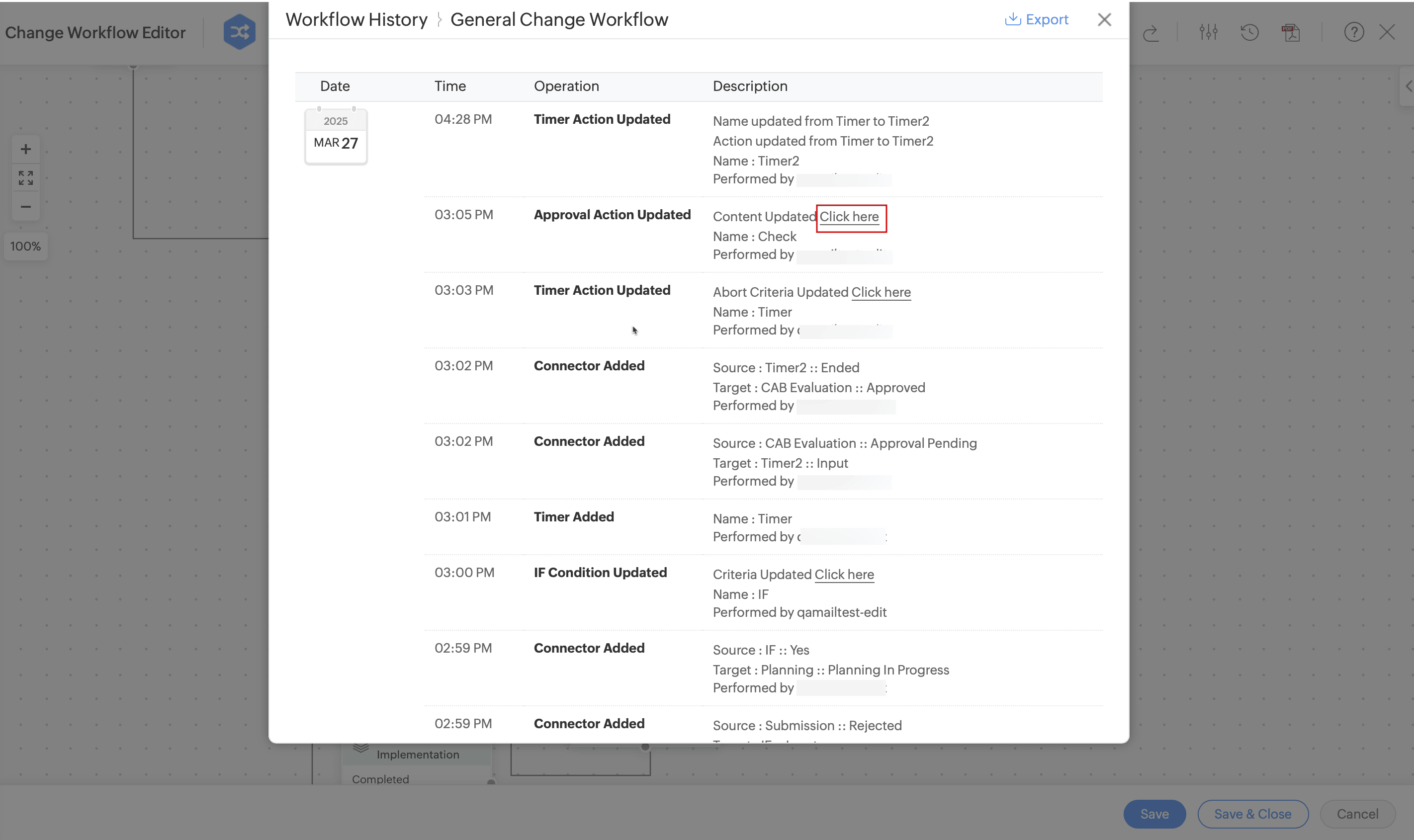You can view action node and condition node updates in the workflow history pop-up by clicking the corresponding link in the description.