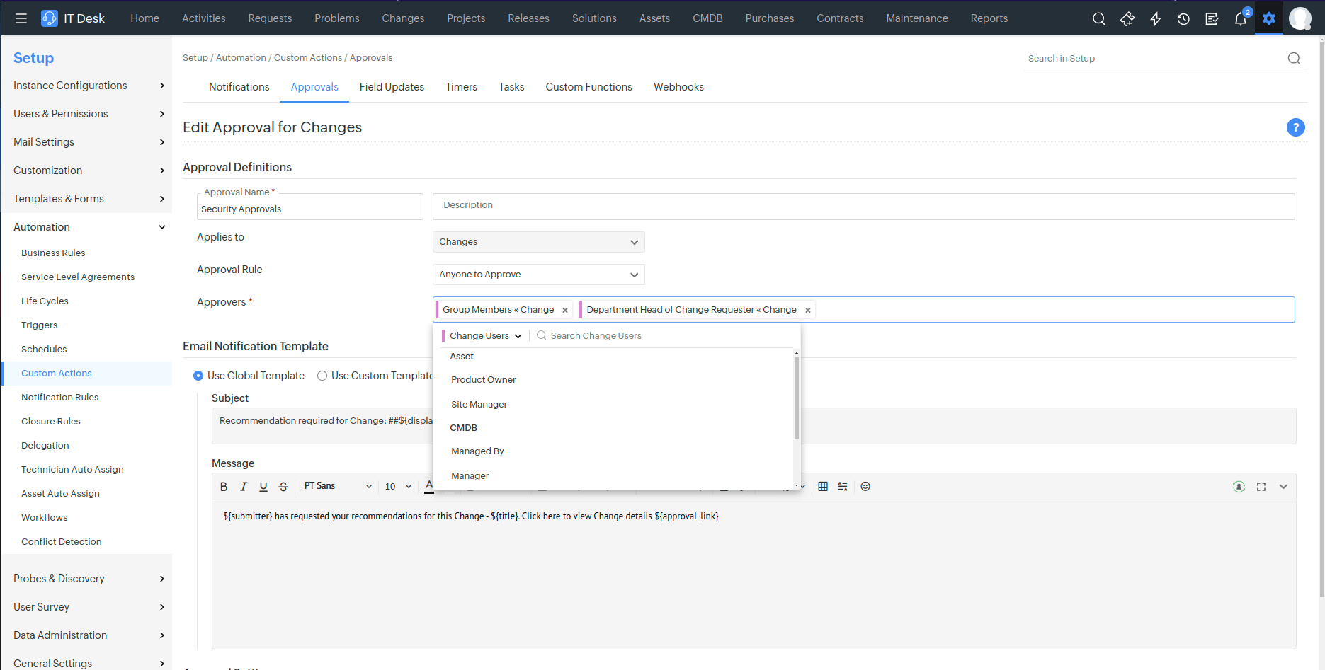 Department Head of Change Requester is now supported as recipient/approver in Change Notifications and Approvals.