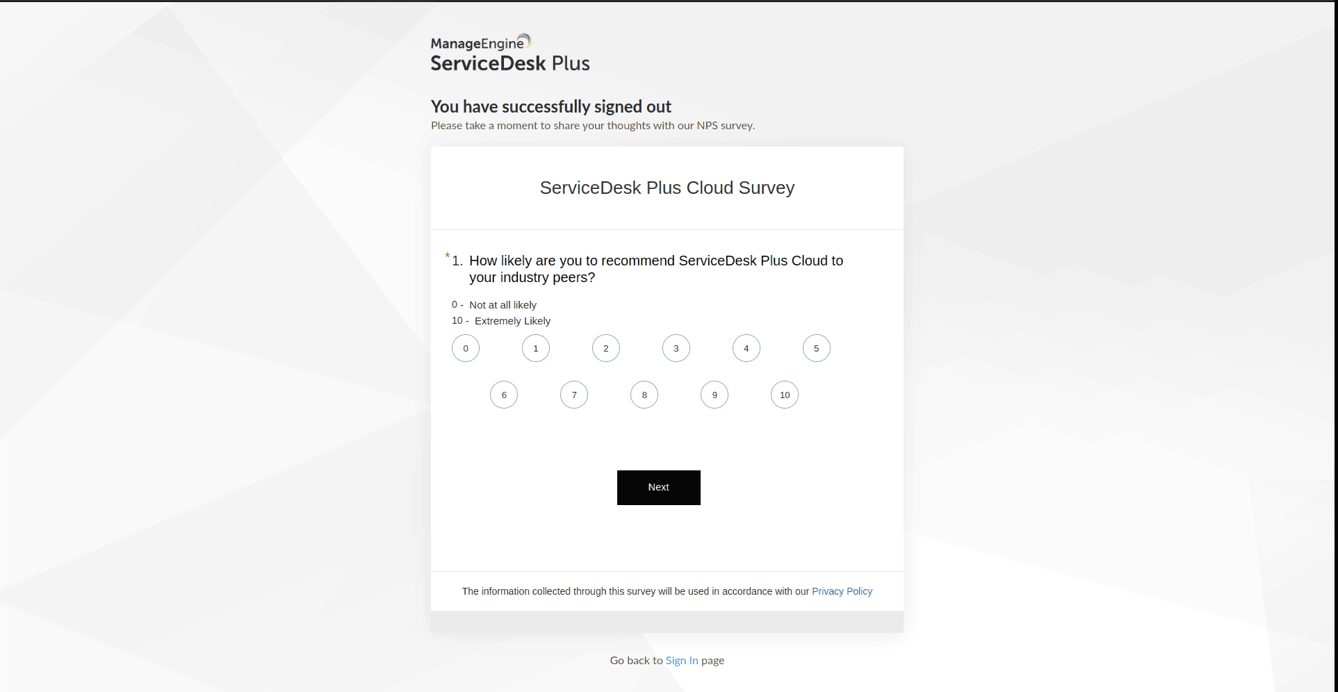 The Net Promoter Score survey included in the application to gather constructive feedback from users. The survey will be shown once a user logs out.