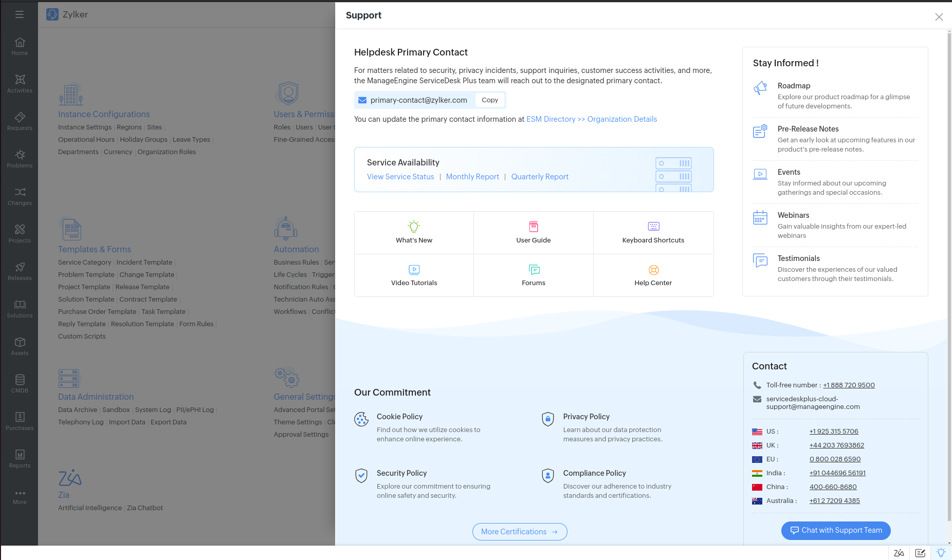 The Discover Product page has been revamped with an enhanced user interface, featuring a dedicated section for Service Availability Status and Reports. Quick links to Roadmap, Pre-Release Notes, Policies, Webinars, Events, Testimonials, and Contact Information are also given. The updated UI will be shown only to technicians.