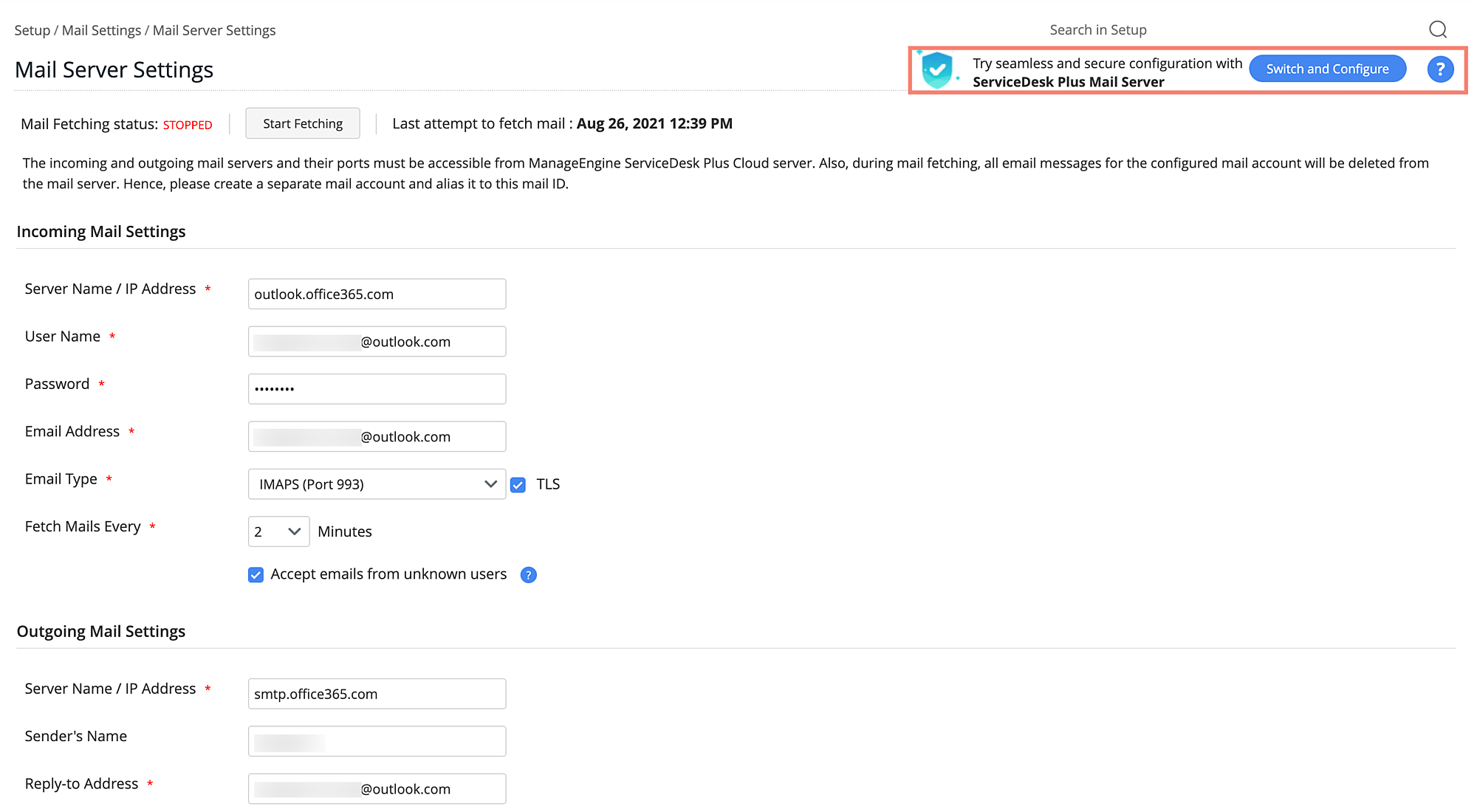 Existing customers can enable the native email service by clicking the Switch and Configure button on the top-right corner of the Mail Server Settings page.